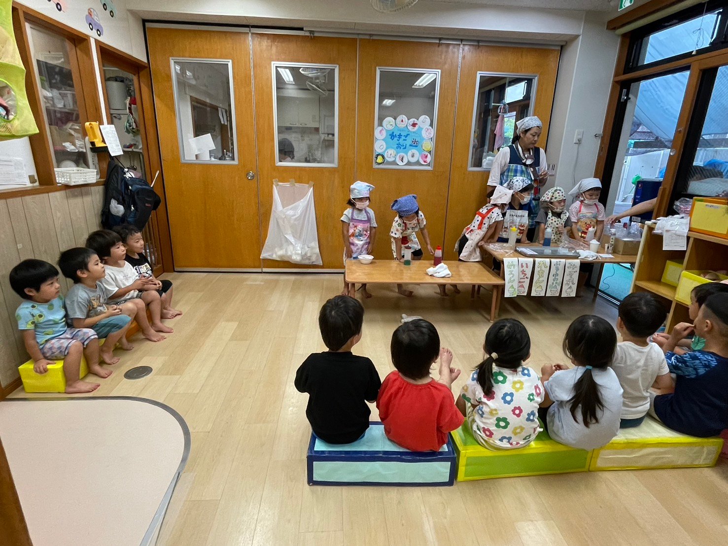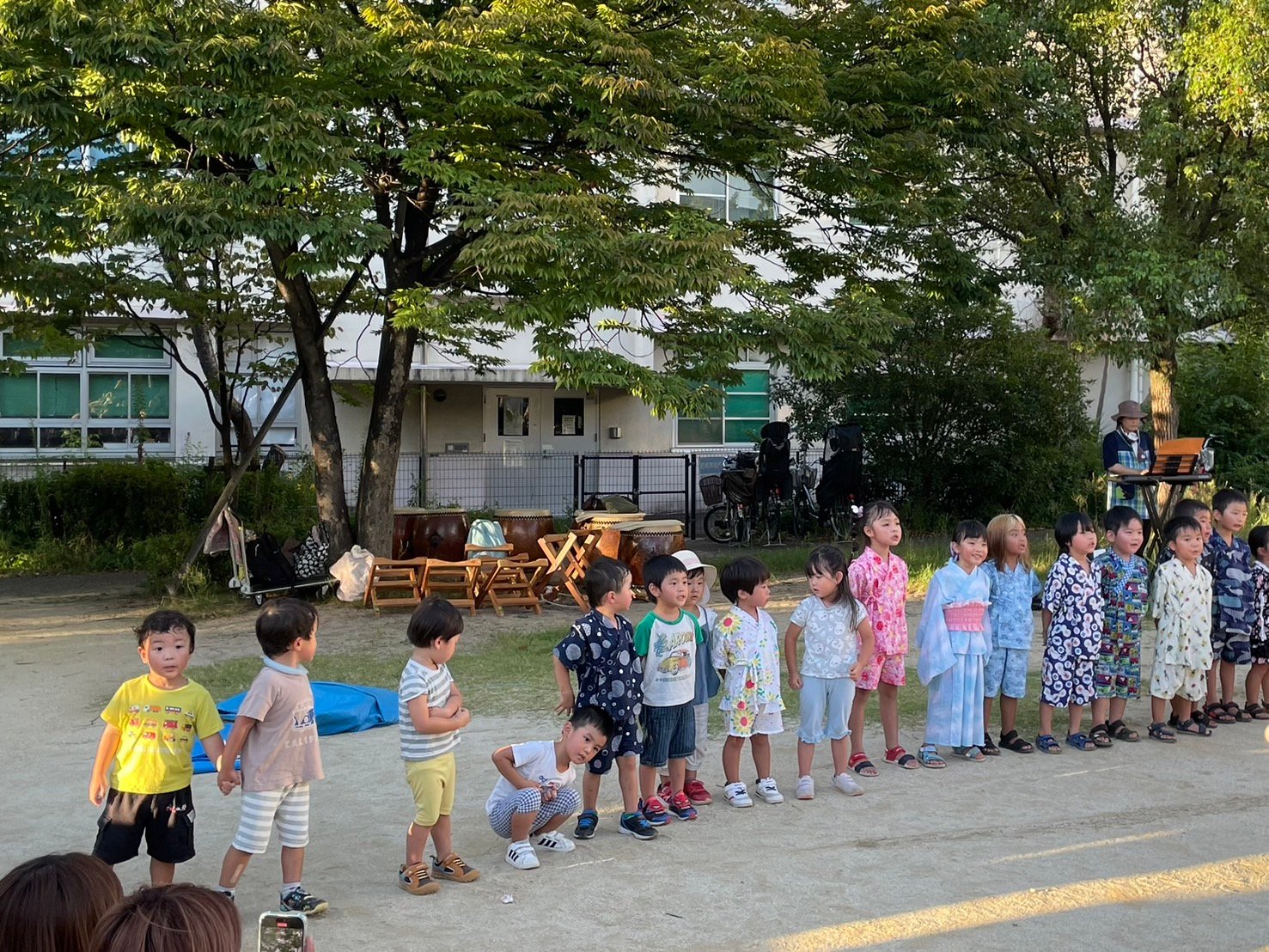 楽しみしていた夕涼み会がありました🌻 オープニングは幼児さんの歌「チポリーノの冒険」「宇宙船のうた」の2曲を歌いましたよ! 初めて参加するとんぼさん。毎朝、はりきって歌の練習に取り組んでいました☺️ 本番はちょっとドキドキ、でも堂々と歌えました✨