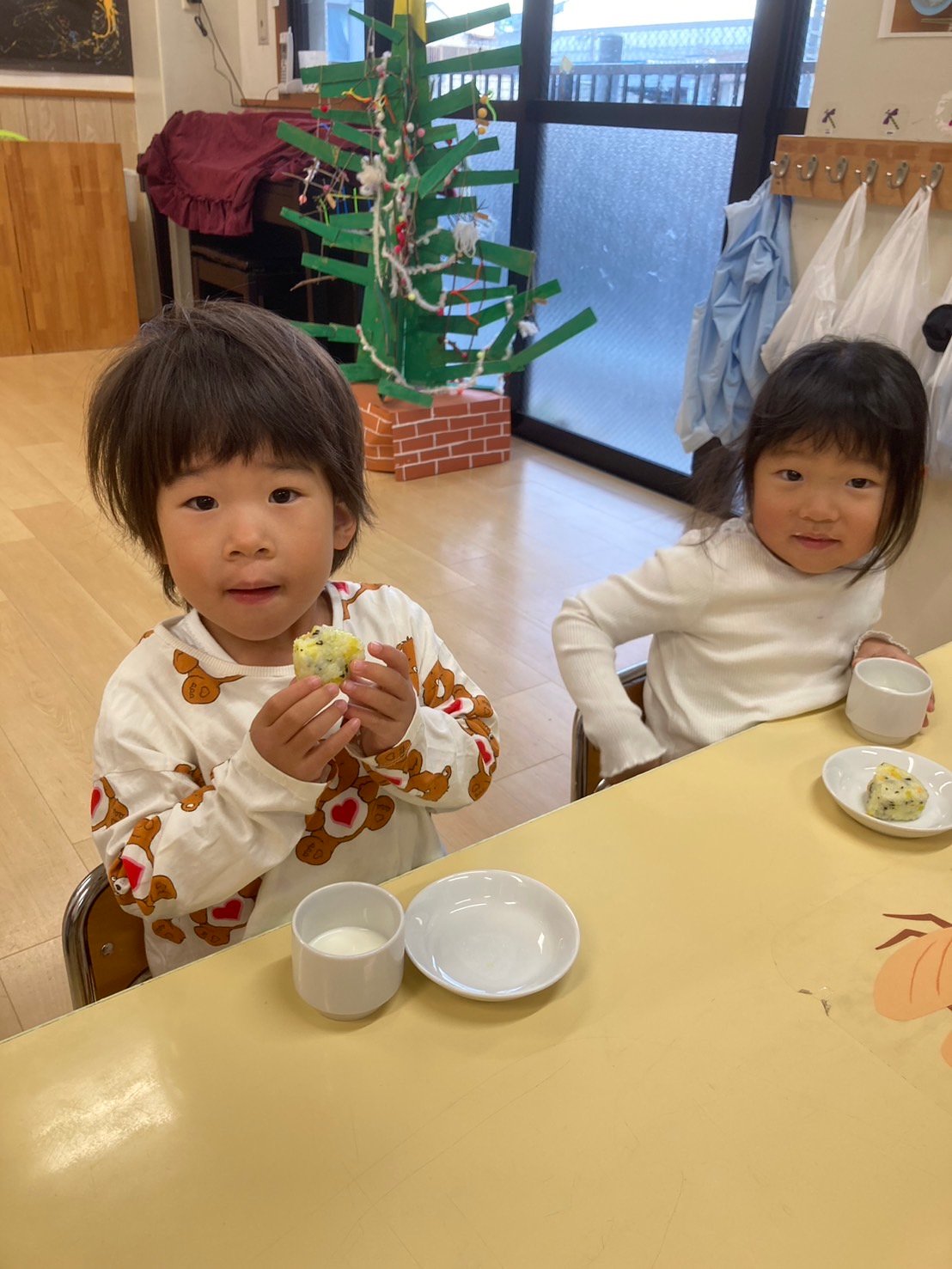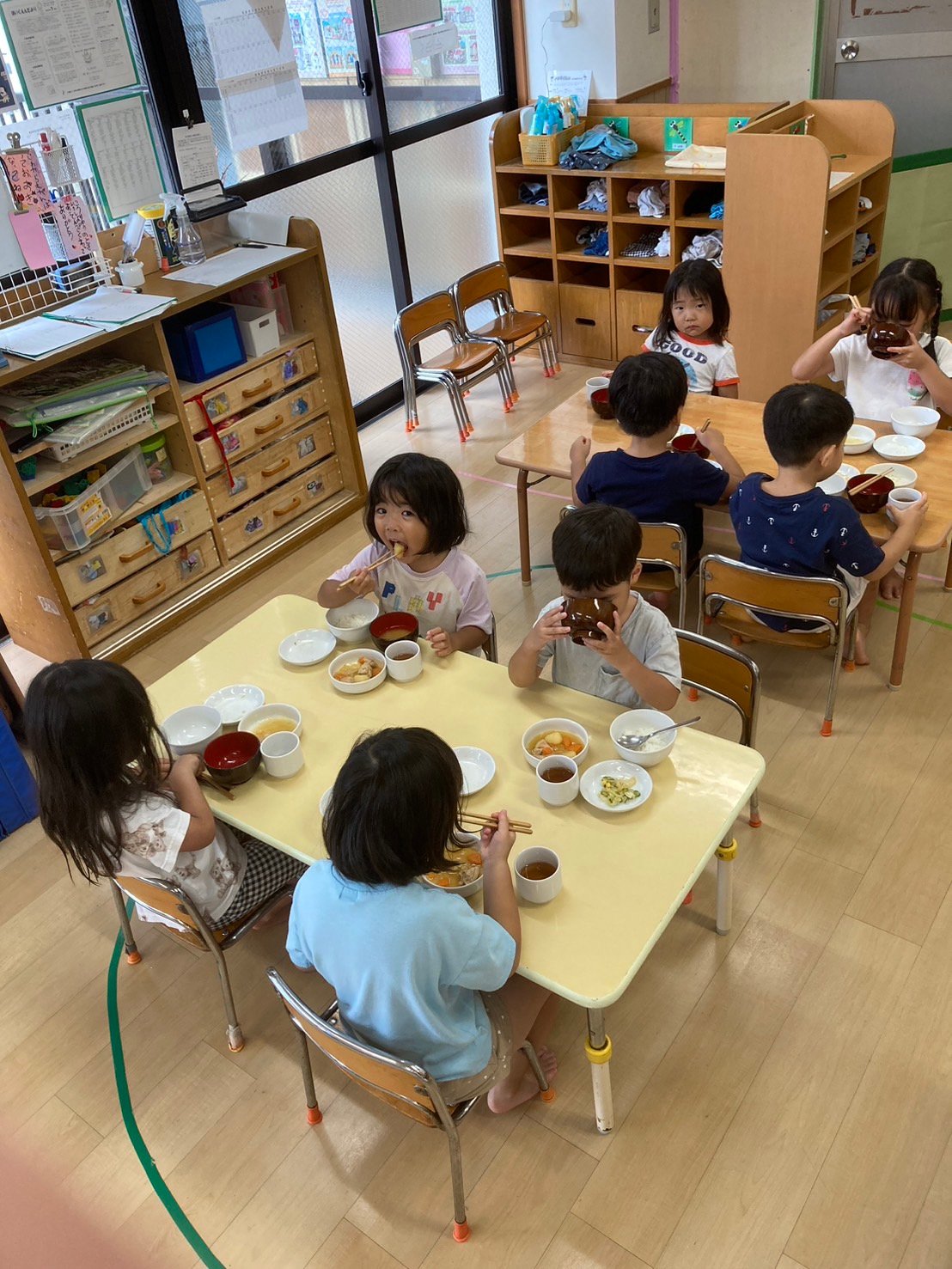 土曜日は3.4.5歳児さん合同で過ごします。 保育士がいくら呼んでも、「ごはんイヤー」「もっとあそびたーい!」という3歳のRくん。 4歳さんが「おいで」と手を差し出すと、さっさと机に着きました。 こんな事がよくある、異年齢保育での場面です。 一緒に遊ぶと「わたしもそれ、したーい」と、遊びの幅も広がります。