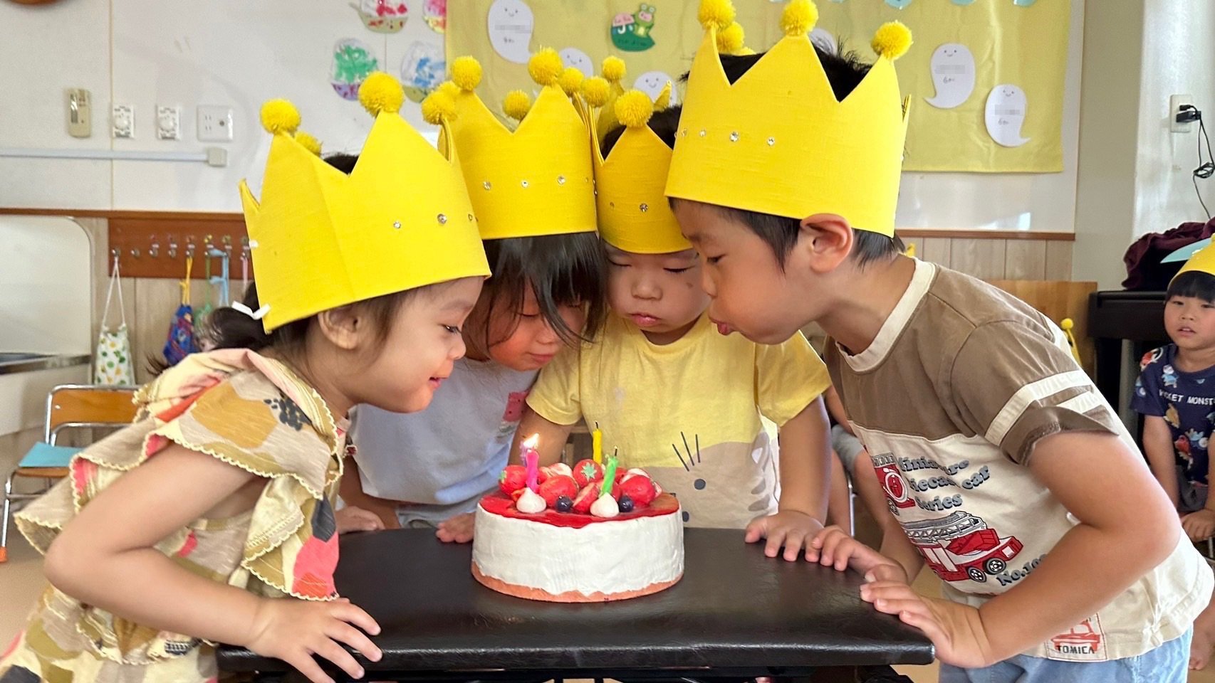 7月のお誕生日会をしました🎂 今月は、4クラス合わせてなんと9人! たくさんのお友だちをお祝いしました🎉 とんぼぐみはSくん、先月参加できなかったMちゃんの2人をお祝いしましたよ。 「〇〇です!」「4さいです!」とインタビューも答えてくれました☺️ お誕生日おめでとう✨