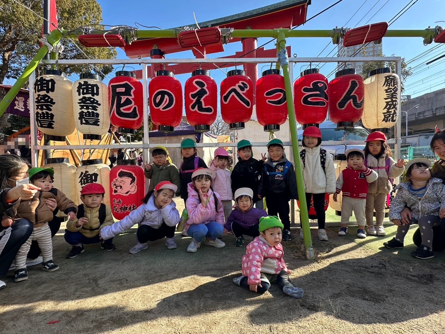 0歳児から5歳児で残り福を貰いに十日戎に行ってきました✨ 異年齢児で手を繋いで参拝に!! 参拝するのにすごい行列だったので まぐろにお金を貼り(貼りたい子)そこからお賽銭を入れてみんなで参拝しました🙏🏻✨ こどもたちは参拝より屋台に目が釘付け(👀笑) 福飴🍬を買って帰りました!!