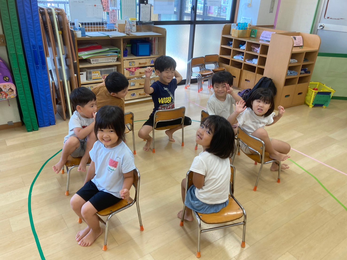 3歳と4歳さん合同で椅子取りゲームをしました。 4歳さんがルール説明をしました。 「はんたいまわりにうごいたら、あぶないからあかんねんで」 「おんがくがとまったら、すぐすわるんやで」 ふむふむ。先輩がわかりやすく説明してくれます。 そして最後「負けても泣かないんやで、ゲームやから」といつも泣いちゃう4歳のKくんとUちゃん。...
