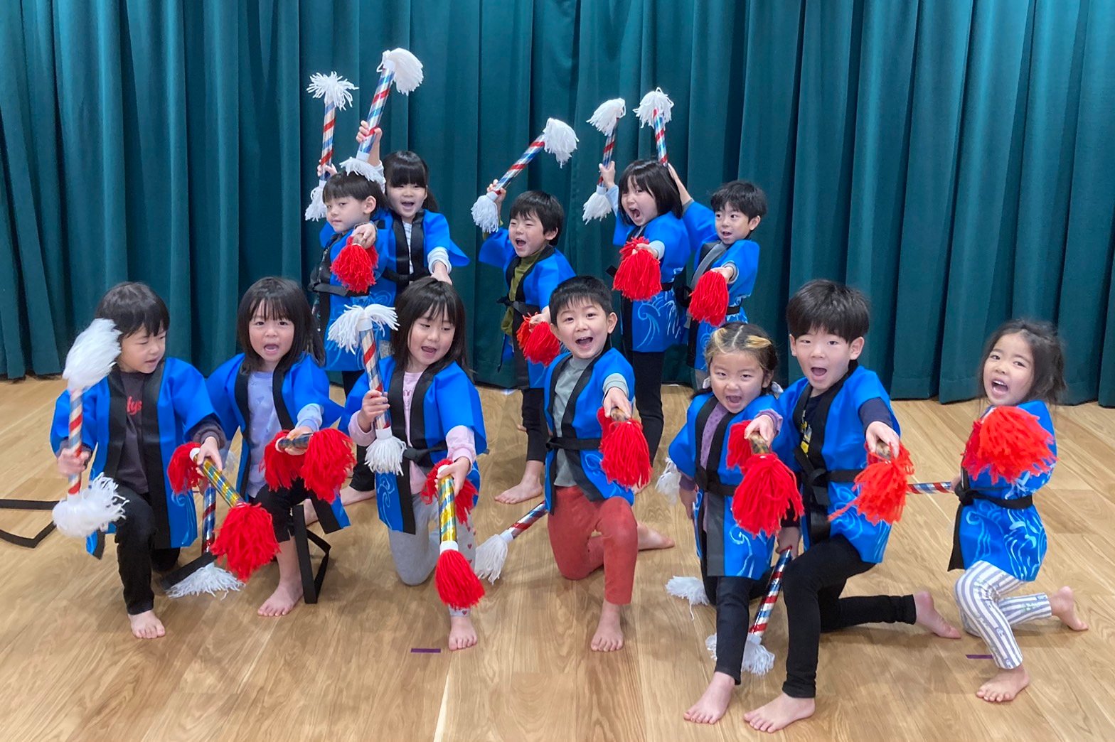 4歳ほたる組さんは今、土曜日の卒園式、成長を祝う会で披露する銭太鼓の練習をがんばっています💪 今日はカッコいいハッピを着て練習をしました。より気合いが入ります。かっこいい!