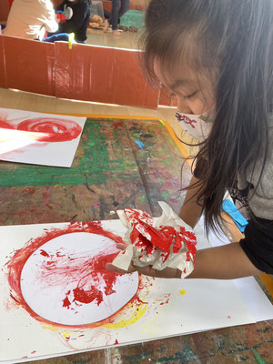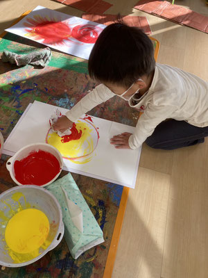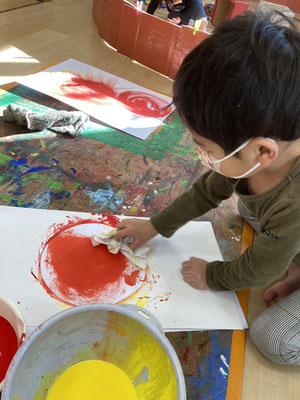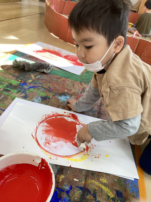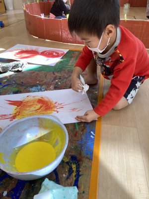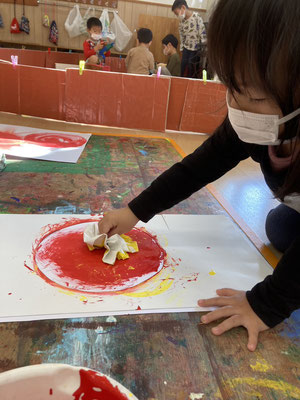 とんぼ組 · 2022/12/22 お正月の壁面制作 ペーパータオルをくしゃくしゃに丸め、絵の具をつけて初日の出🌞を描きました。 お日様ってどんなの?と聞くと、 「ビカビカ!」「まぶしい!」と口々に教えてくれたこどもたち。ぴっかー!と言いながら絵の具をぬっていました。 tagPlaceholderカテゴリ: 令和4年度とんぼ組