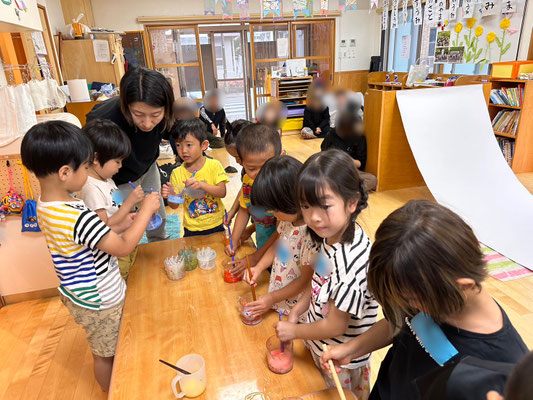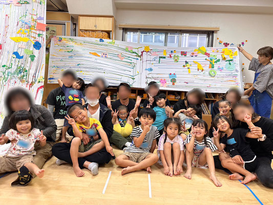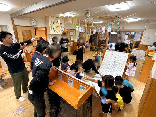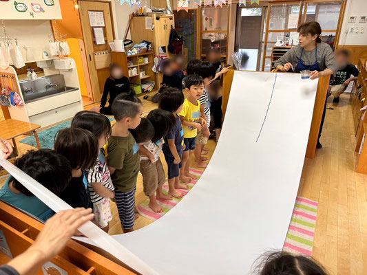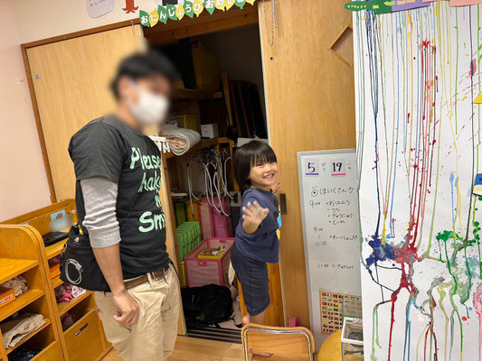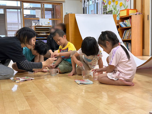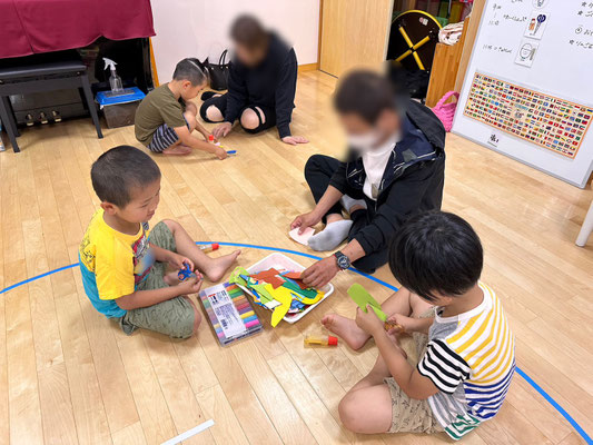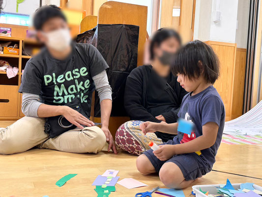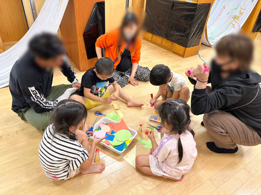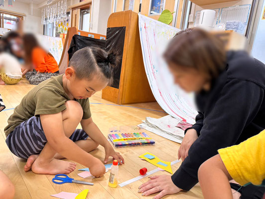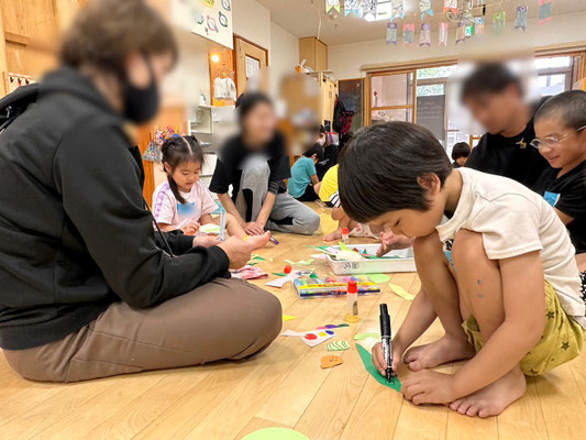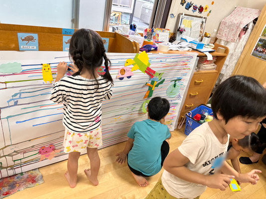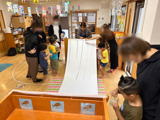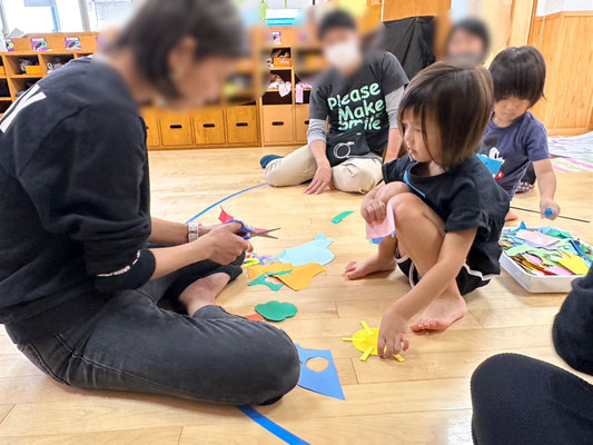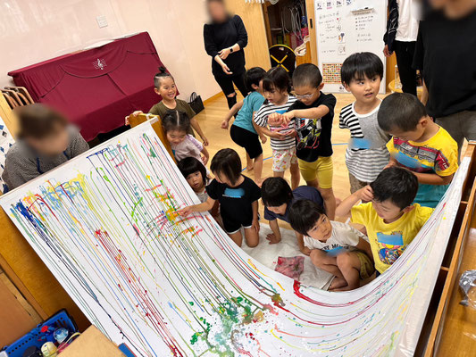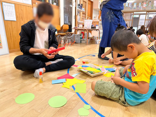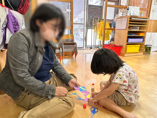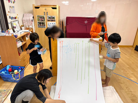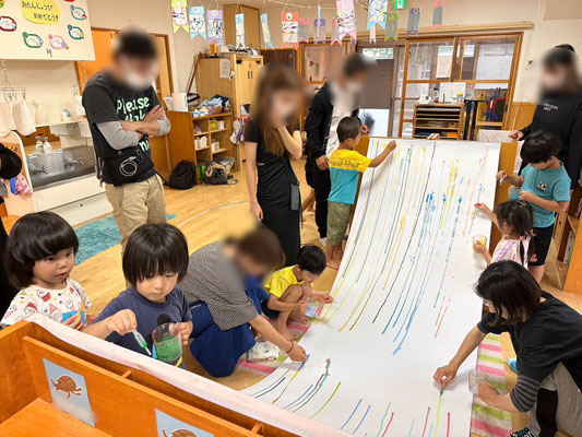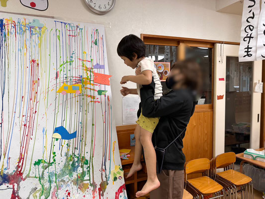 かぶとむし組 · 2023/05/19 \\ 親子WS // 〜保育参加〜 2023.05.23 いつも楽しみにしている、WS。 今日はお父さんお母さんも一緒ということで、みんな大はりきり!! 部屋いっぱいの大きな紙に、スポイドを使って絵の具を垂らして遊びます。 流れていく様子や、色が混ざる様子、水たまりを楽しみました。 その後はどんな世界にするか話し合い、色々な形の画用紙を組み合わせ車、人、花などを作りました。 素敵な街が出来上がりましたよ💕 雨の中、ご参加ありがとうございました。 tagPlaceholderカテゴリ: 令和5年度かぶとむし組