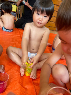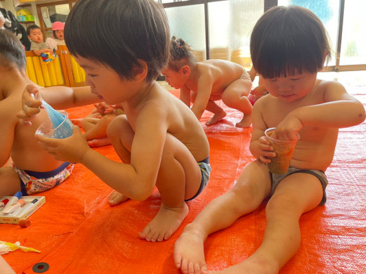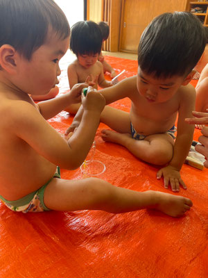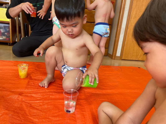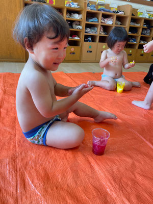 洗濯糊、絵の具、魔法の水を混ぜるところから…「うわ〜」と、色や感触の変化に夢中のみつばちさん♬