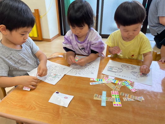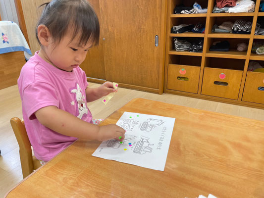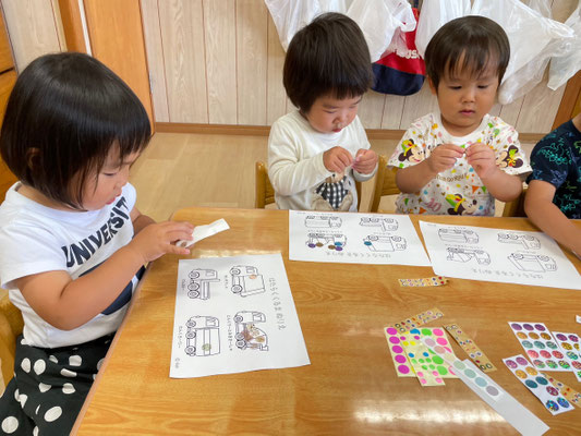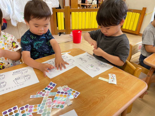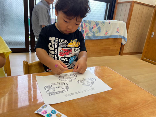 みつばち組 · 2023/06/22 シール貼り みつばちさんが大好きな「はたらくくるま🚔🚑🚌」の紙で、指先を使い、シール貼りをしました🙌 タイヤ🛞にうまく貼ったり、くるま全体をキラキラにしたり、それぞれじっくり集中しながら楽しんでいましたよ〜♡! tagPlaceholderカテゴリ: 令和5年度みつばち組