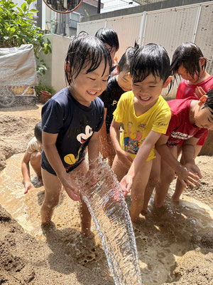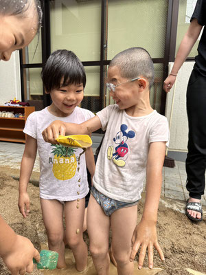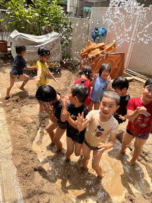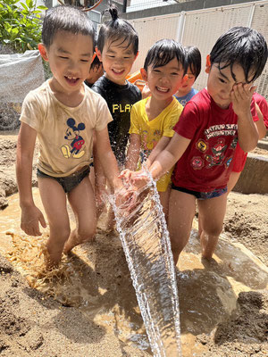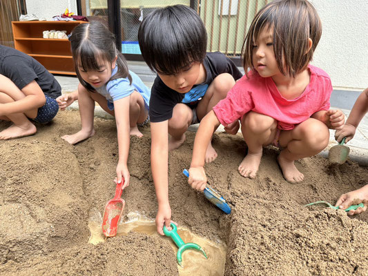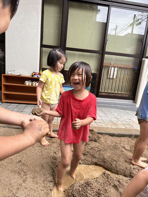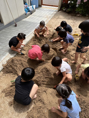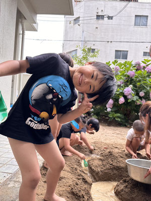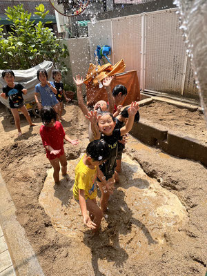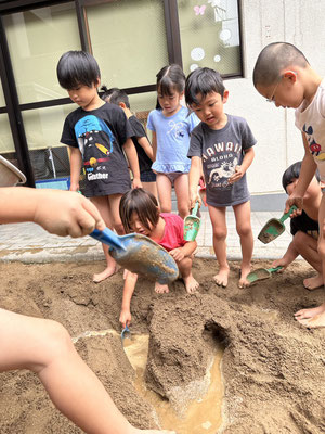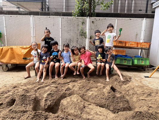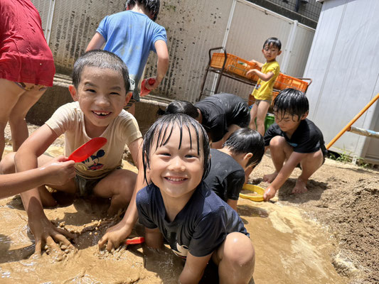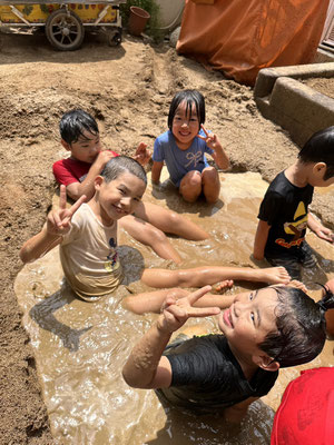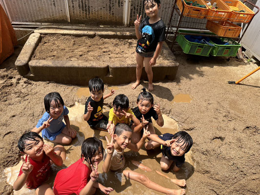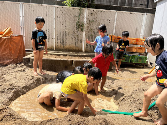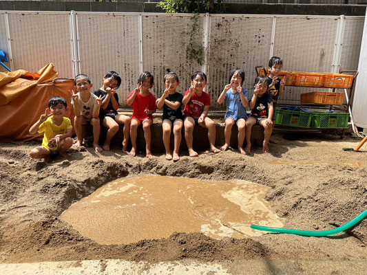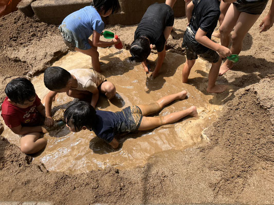 かぶとむし組 · 2023/06/28 \\ 泥遊び // 2023.06.09・06.28 暑くなってきて、泥んこ日和☀️ まずはみんなで何を作るか相談タイムが始まります🤔「川?山?お風呂?」とたくさんのアイデアがでてきます。決まったらスコップ片手に堀りはじめます。 1回目は… 『ウォータースライダー』 2回目は… 『温泉』 と、大作の完成✨ みんな顔まで泥んこになって遊びましたよ💦 片付けまでが泥んこあそび!しっかり自分達で水を運び、土で埋めて…元通り👍さすがかぶとさん💕 最後はシャワーとお風呂でスッキリ❕ とっても楽しかったね✨ tagPlaceholderカテゴリ: 令和5年度かぶとむし組