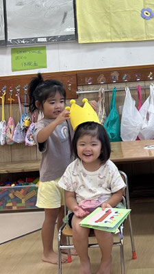 とんぼ組 · 2023/06/29 お誕生日会 とんぼ組Rちゃん4歳のお誕生日会でした。 みんなの前に座るだけでも緊張します。事前にお名前とお年が言えるように練習しました。 本番では練習になかったのですが、「好きなたべものは?」と聞くと「アイスクリーム🍨」と元気にこたえてくれました。 お友達にバースデーカードと冠👑をもらい、 『やだっとちゃん』のパネルシアターを楽しみました😀 tagPlaceholderカテゴリ: 令和5年度とんぼ組