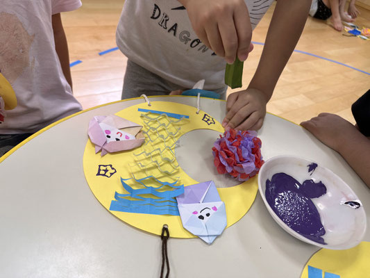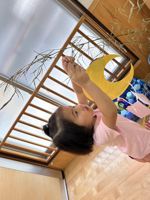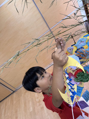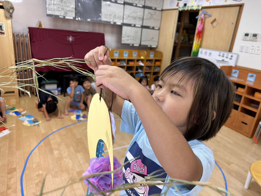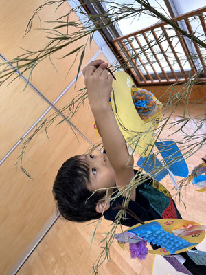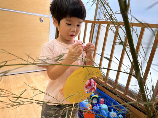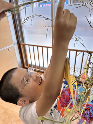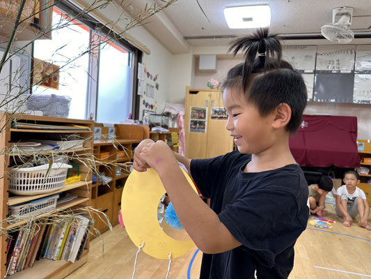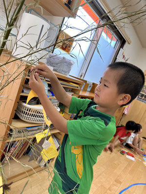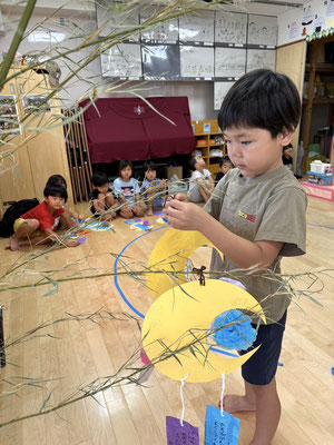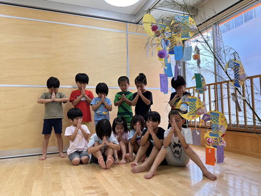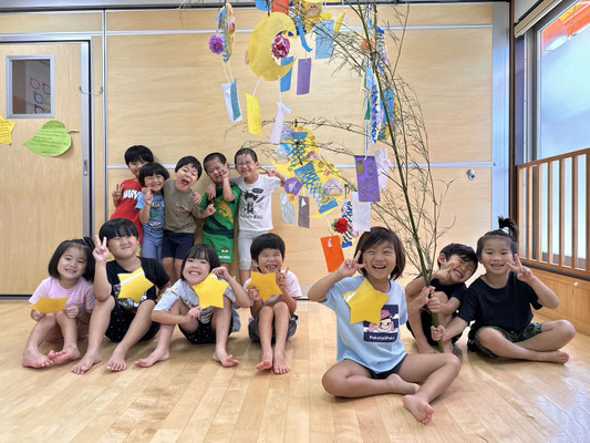 かぶとむし組 · 2023/07/06 \\ 七夕 // さ〜さ〜のは〜 さ〜らさら〜♬ 七夕のつどいで、ほたるさんと一緒に"おりひめとひこぼし"という簡単な七夕物語を鑑賞しました🎥 天の川や織姫(ベガ)、彦星(アルタイル)、かささぎ(デネブ)の星を写真で見て勉強もしましたよ⭐️ そのあとは各クラスに分かれて短冊🎋紹介!! 「ねがいごとがかないますように」と祈りました✨ 七夕飾りの星スタンプは自分たちで育てているオクラです! tagPlaceholderカテゴリ: 令和5年度ほたる組, 令和5年度かぶとむし組