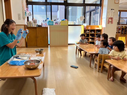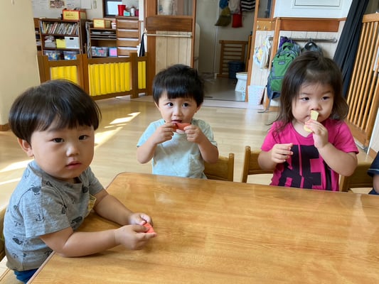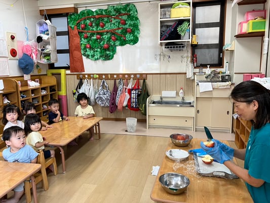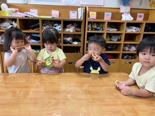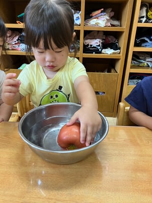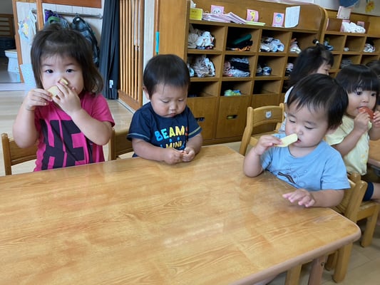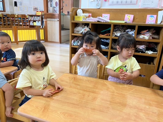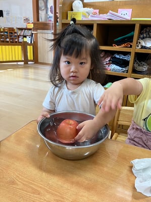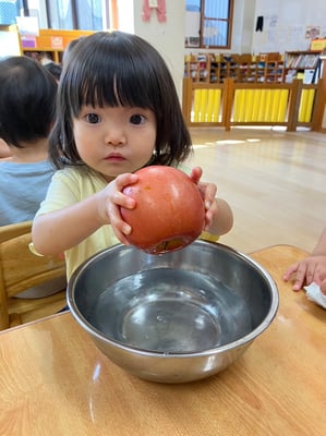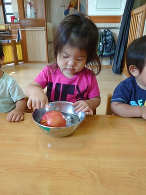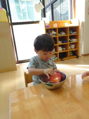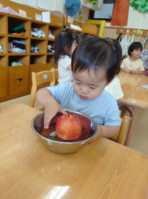 ちょうちょう組 · 2023/10/25 クッキング 今日はりんご🍎のクッキング! ボールに水を入れて洗いました。みんな上手に優しく、洗っていましたよ。 そして、とても楽しそうでした♪ 先生がりんごの皮をむく様子を見て、皮を触って、匂いを嗅ぎました。 甘い匂いがしましたよ! 最後はみんなで食べました🍎りんごが苦手な子もひと口、食べていましたよ! 美味しかったね! tagPlaceholderカテゴリ: 令和5年度ちょうちょう組