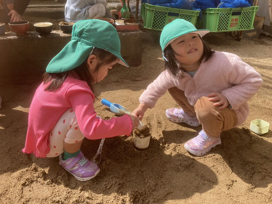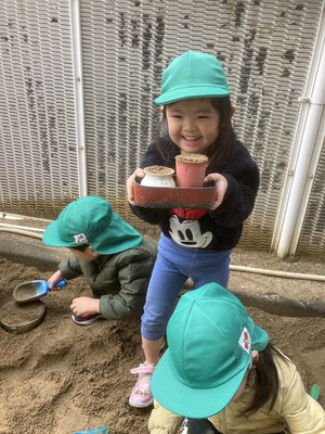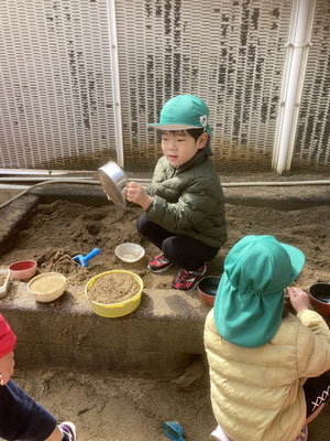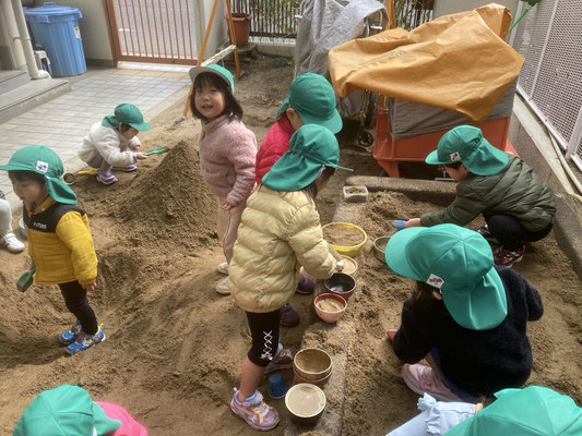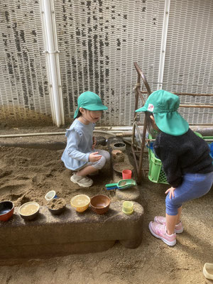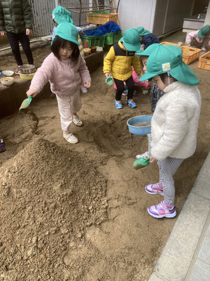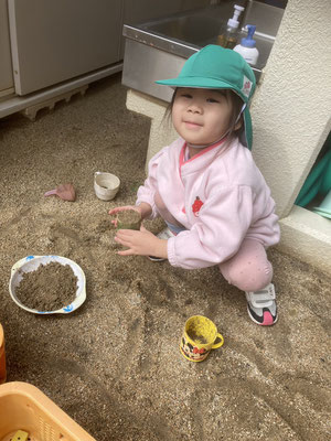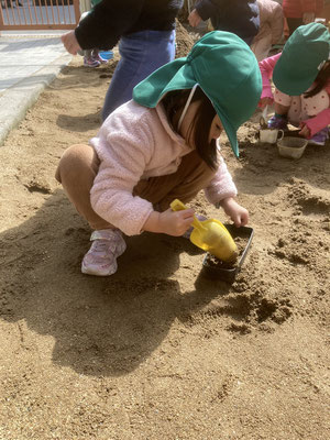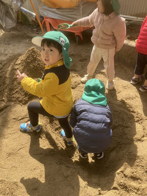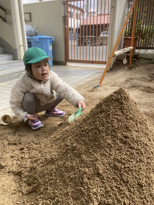 いいお天気🌞の中、久しぶりに園庭で砂遊びをしたとんぼ組さんたちです