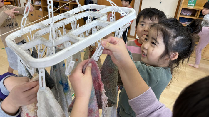 使った雑巾を洗って紐に干してから、外に干すためピンチハンガーに干し直しました笑