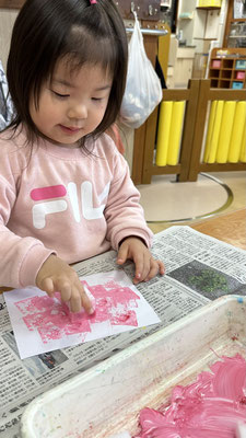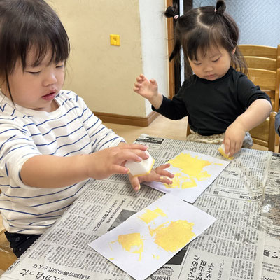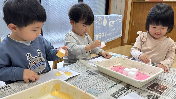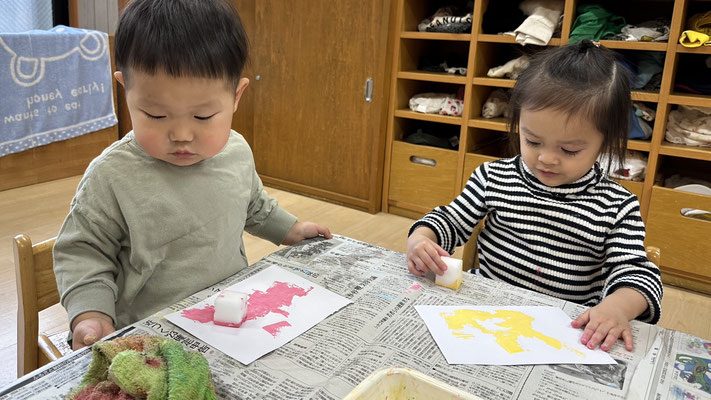 スポンジを使って画用紙いっぱいスタンプしましたよ☺️