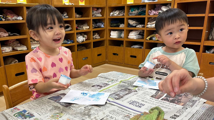 絵の具を混ぜると「○○色になった~!」と集中してみていました👀