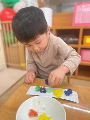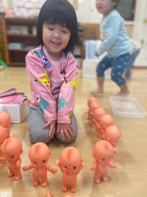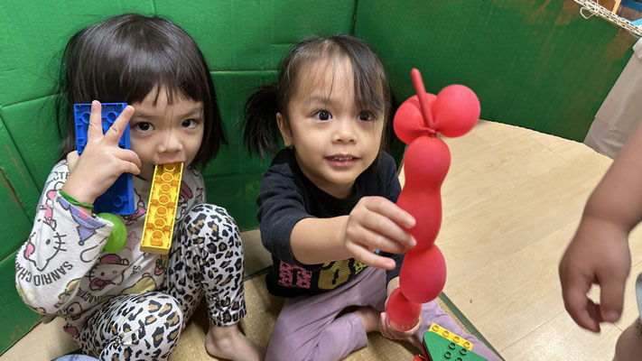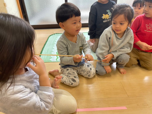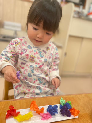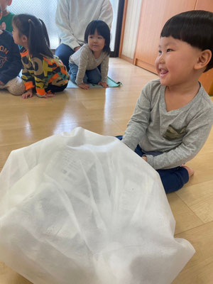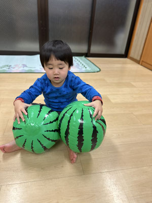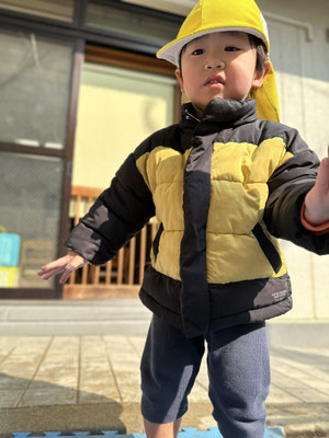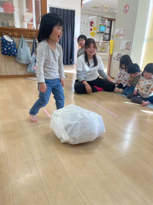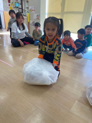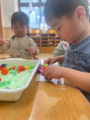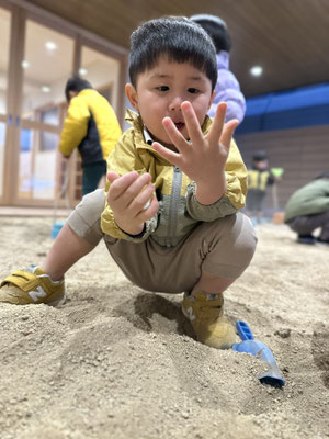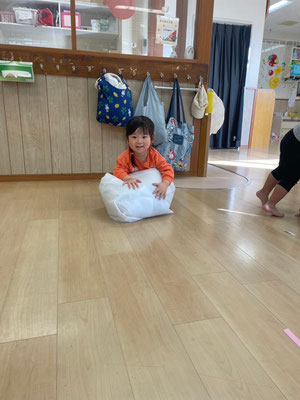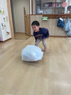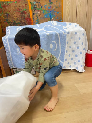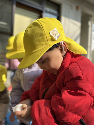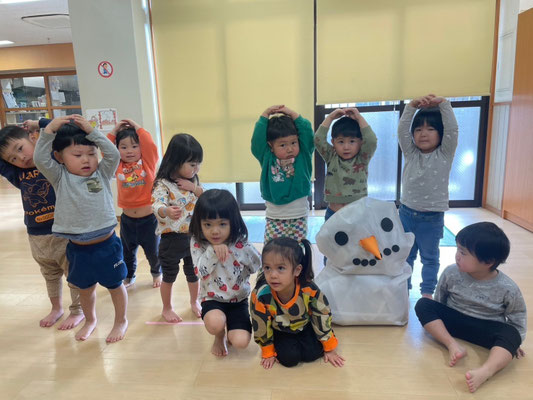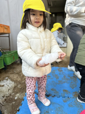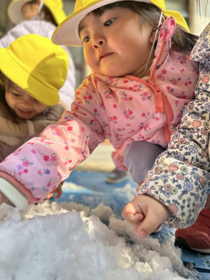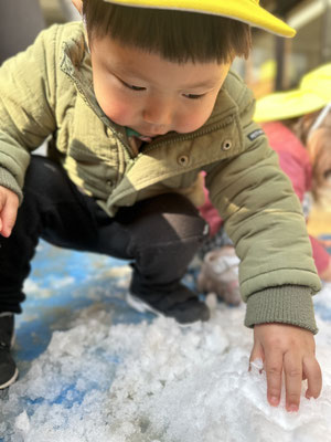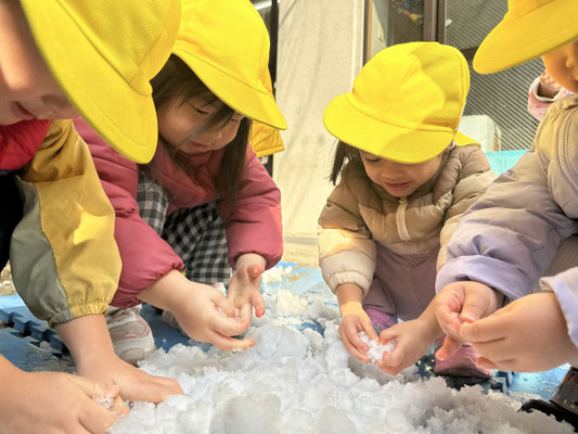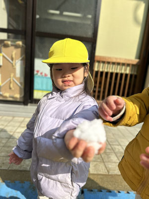 「つめた〜い」と言いながら、手や足で感触を楽しみ、上に投げて「わぁ〜」と楽しんだり、ちっちゃな雪だるまを作ったりしましたよ🤭
