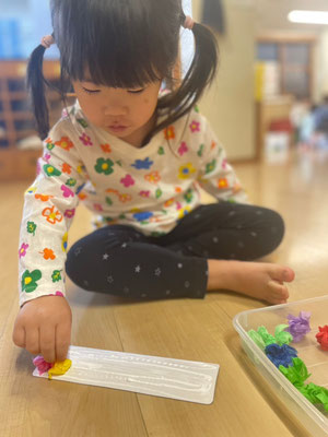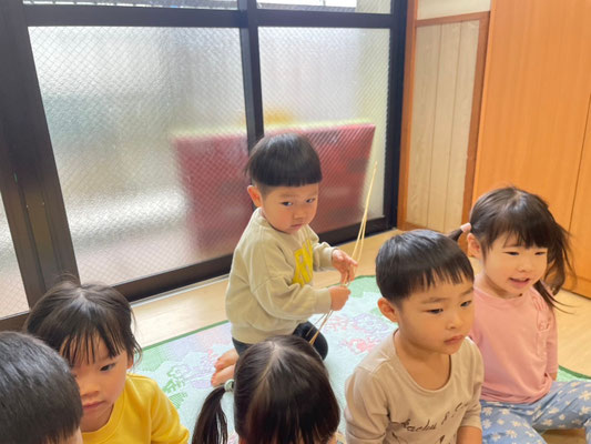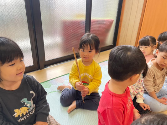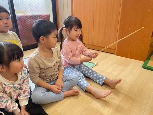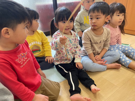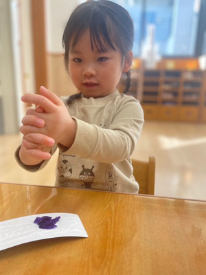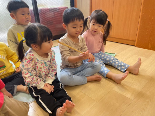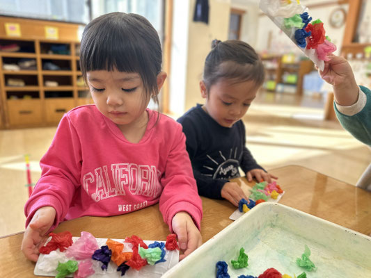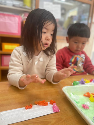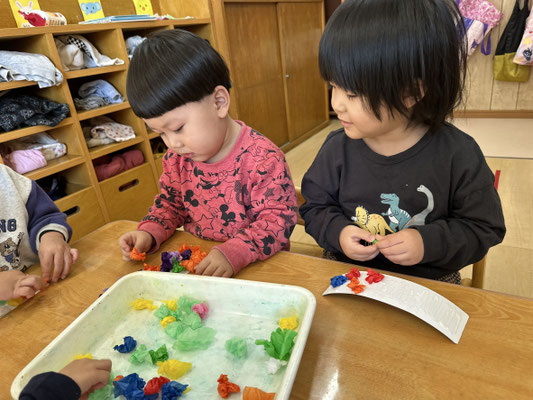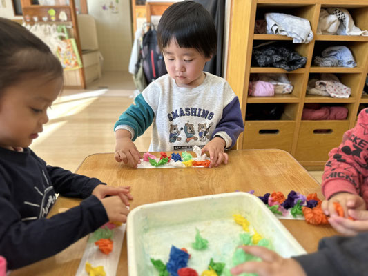 ほたるさんかぶとむしさんが雪あそびに行った日に、実はみつばちさんも保育室で雪あそびをしていましたよ!