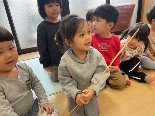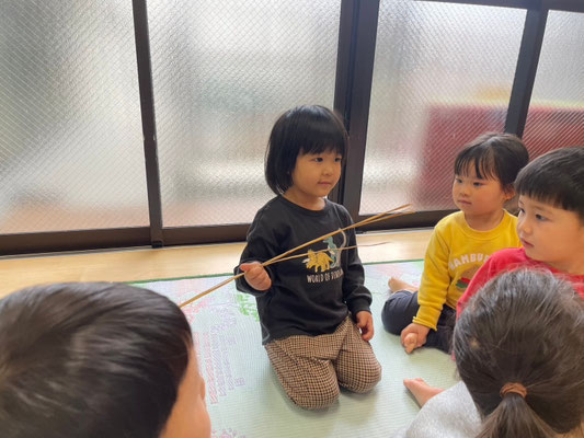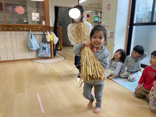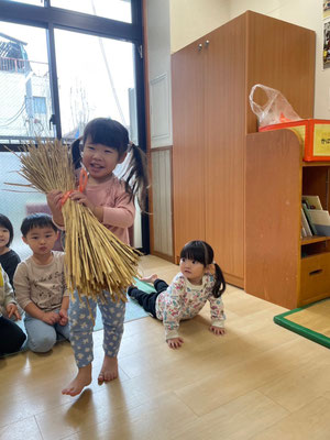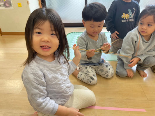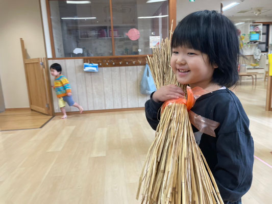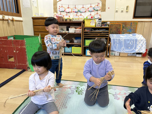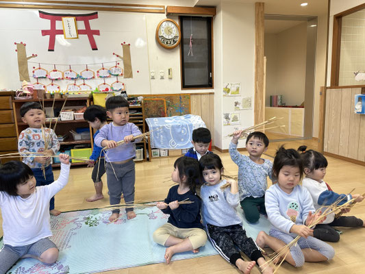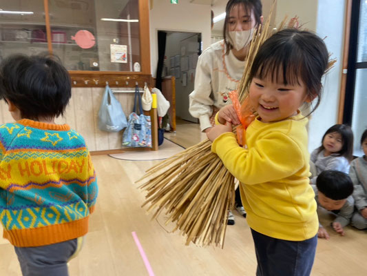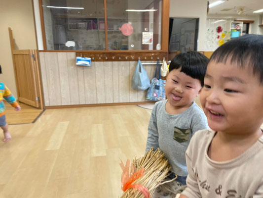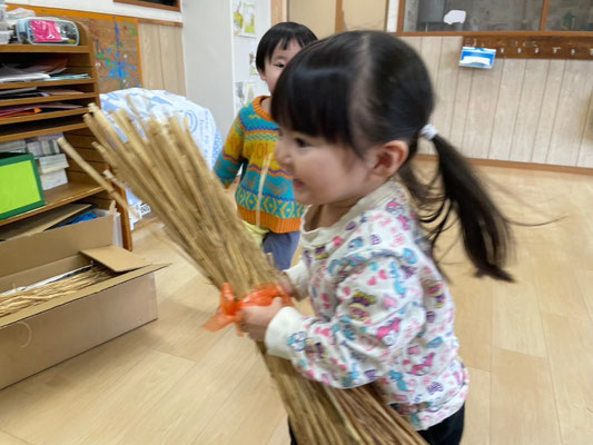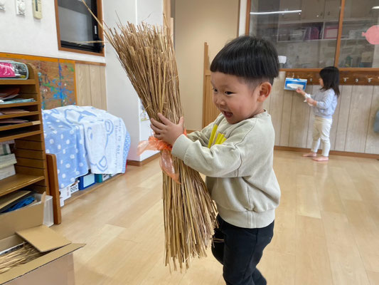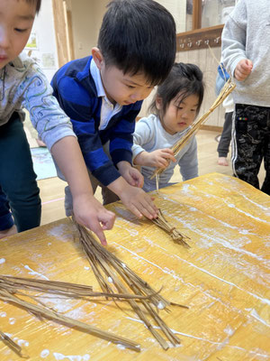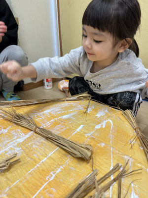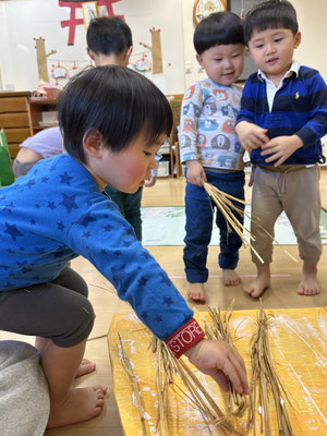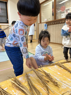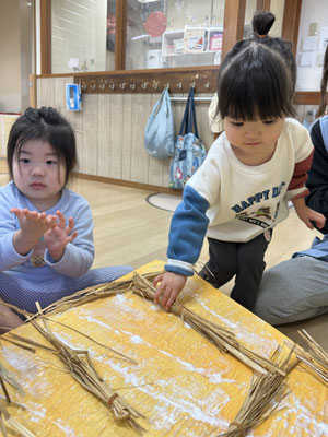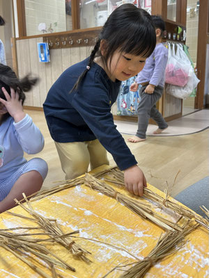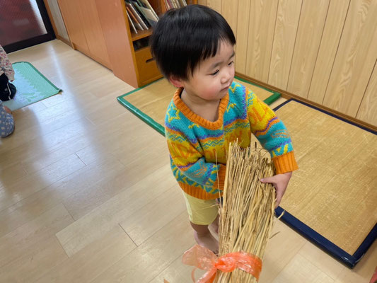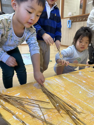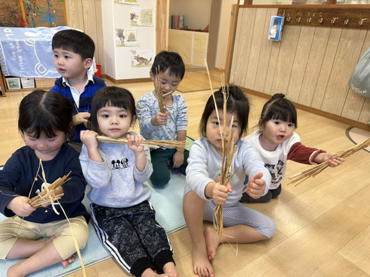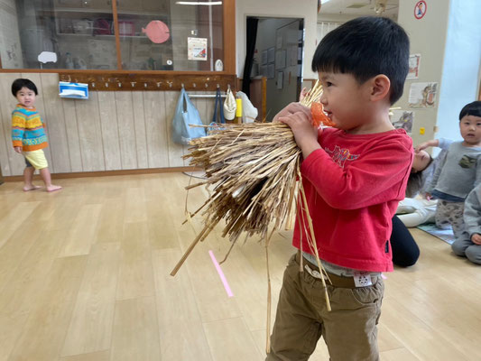 藁を縛って担いだり、劇で使う藁のお家を作りました🌾