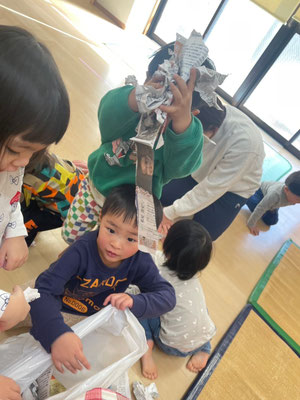 新聞紙を丸めて雪に見立て、最後は雪だるまを作ってハイッチーズ📸