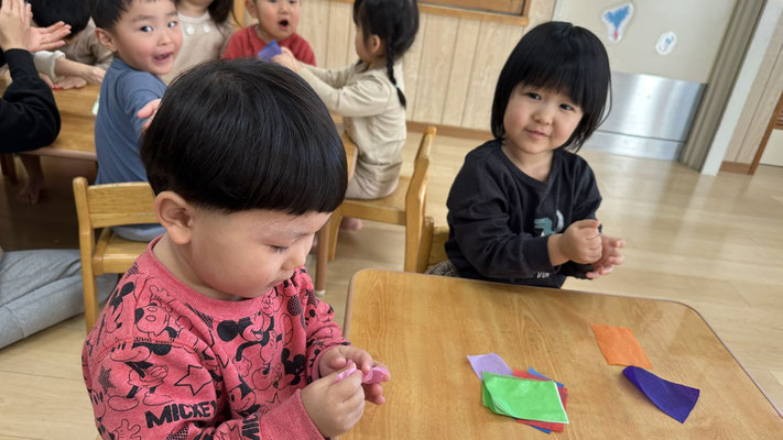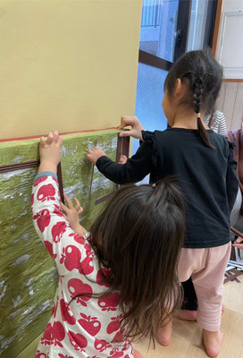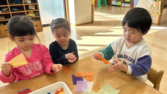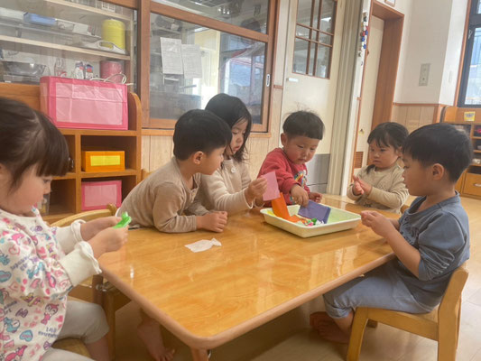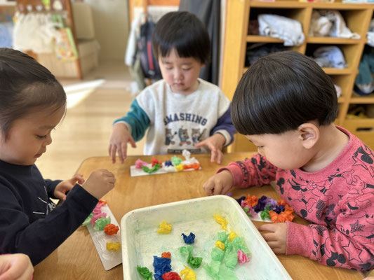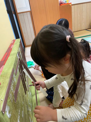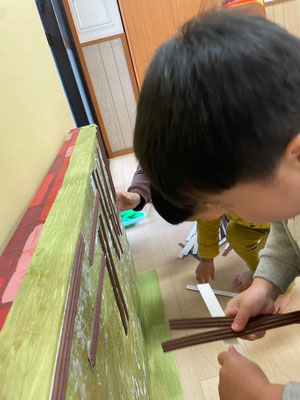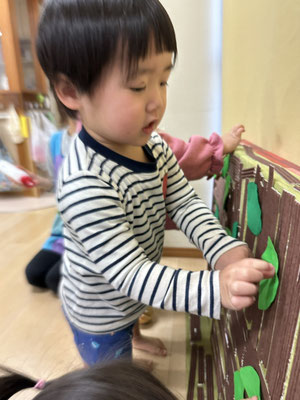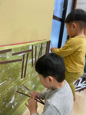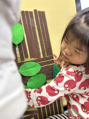 木のお家は、木に見立てた紙を“トントンッ”と叩きながら付けたり、葉っぱで飾りを付けたりしました🌳