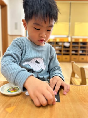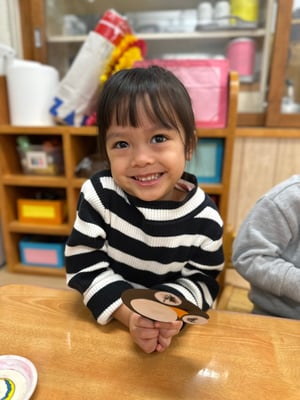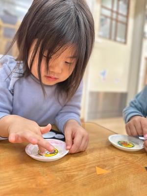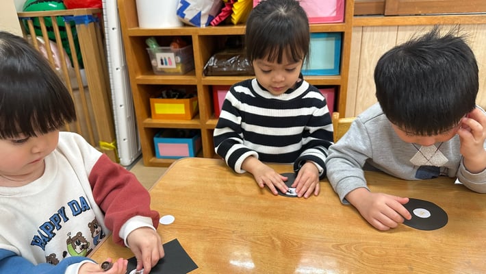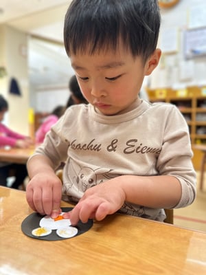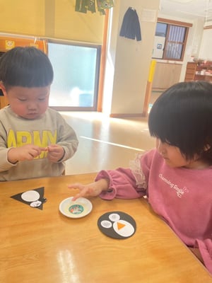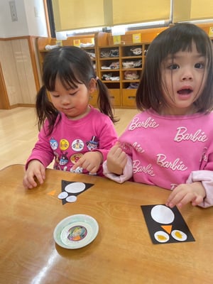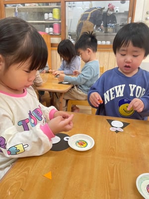 丸に目を書いたあと、○ △ □の中から形を選び、目やお腹、口を貼りました!