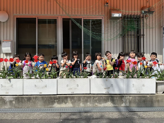 分園に咲いたチューリップと13人で写真を撮りましたよ🌷