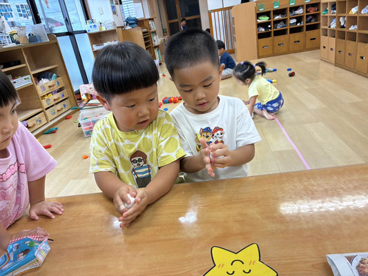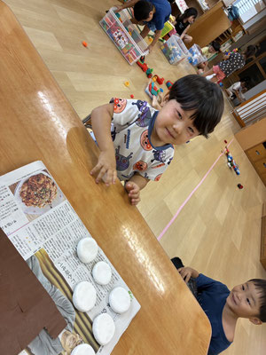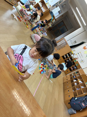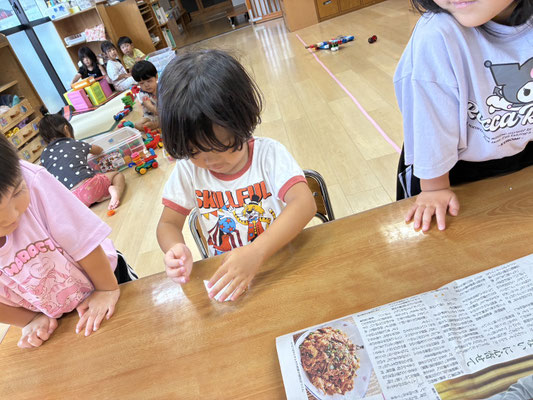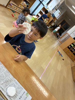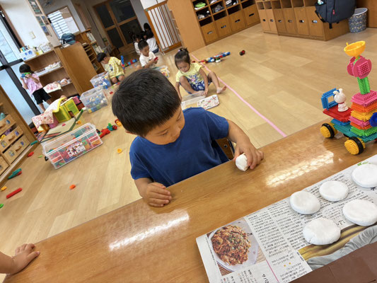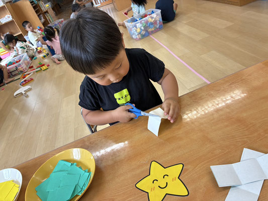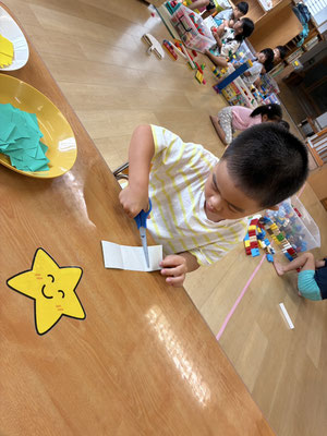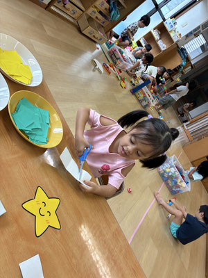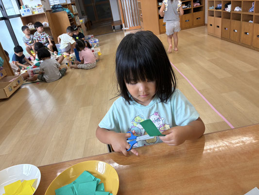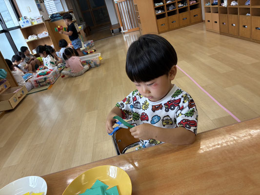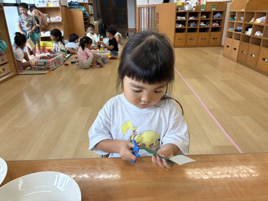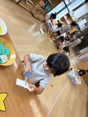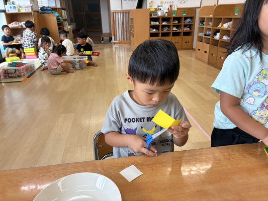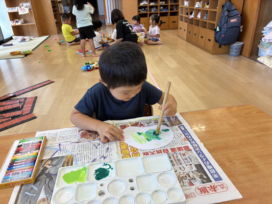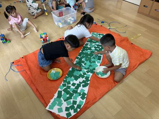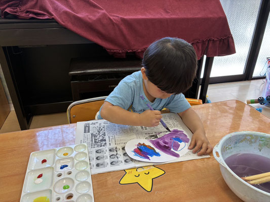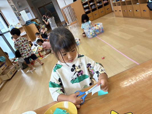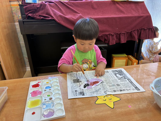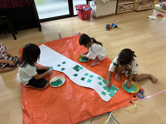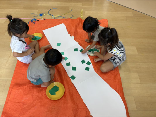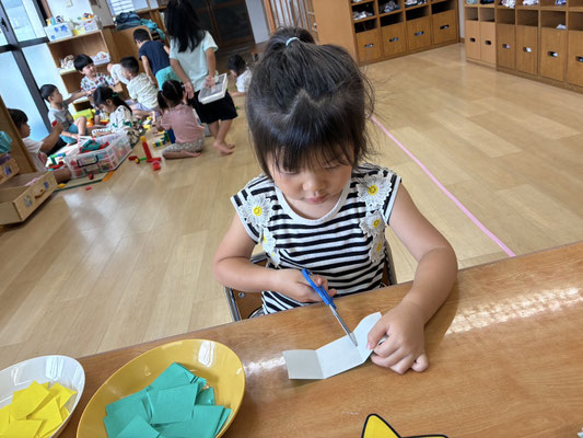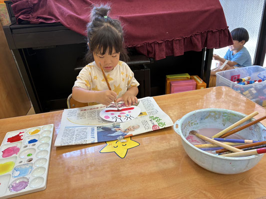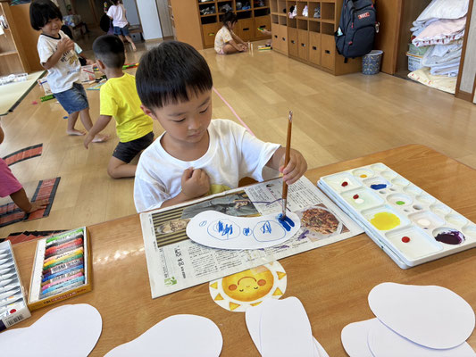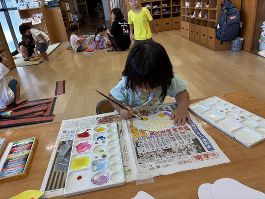 9月の制作は、絵の具やクレヨン、のりにはさみと、いろんな物を使って作りました✨