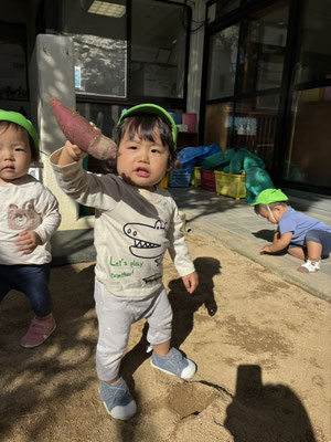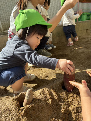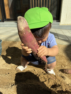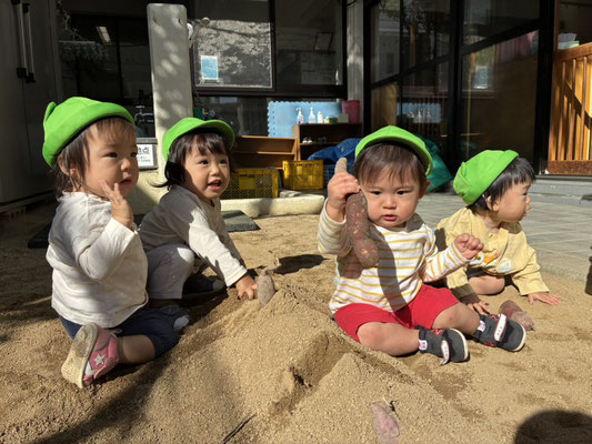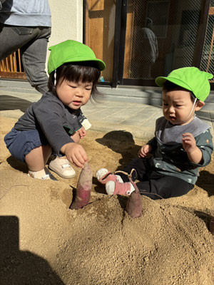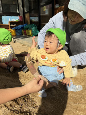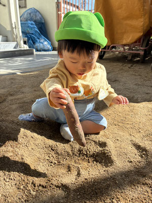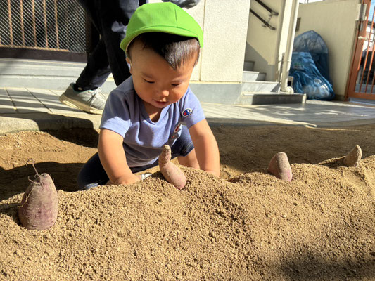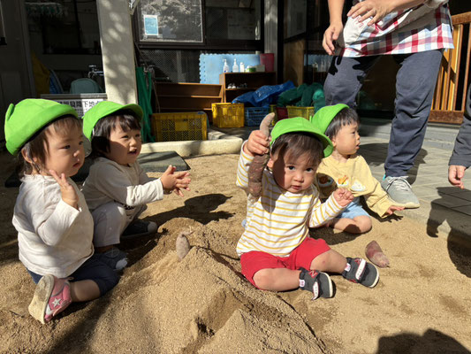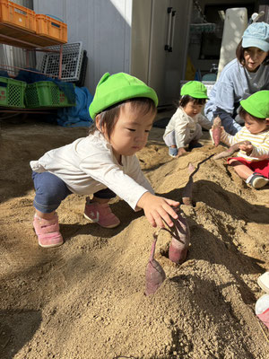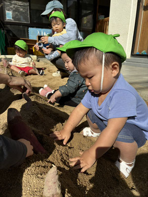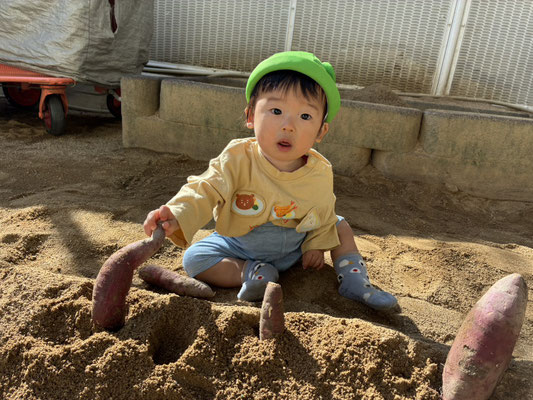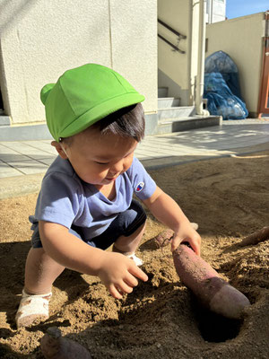 かたつむり組 · 2025/10/30 はじめてのおいもほり♪ 園庭でおいもほりをしました🍠 幼児さんたちがいもほり遠足で持って帰ってきてくれたさつまいもを使って、かたつむりさんも初めてのおいもほりに挑戦です✨ 土からひょっこりとでたおいもを見つけると「なになに?」と興味津々! でもすこし慎重な様子で、しばらく眺めてから手を伸ばしていましたよ 積極的なお友だちの姿につられて、最後はみんなでおいもほりを楽しんでいました☺️ tagPlaceholderカテゴリ: 令和7年度かたつむり組