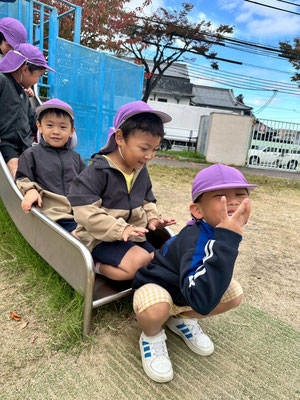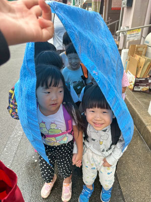 本園から分園へ行く際に雨がパラパラ降ってきたので、みんなでブルーシートの下へ!
