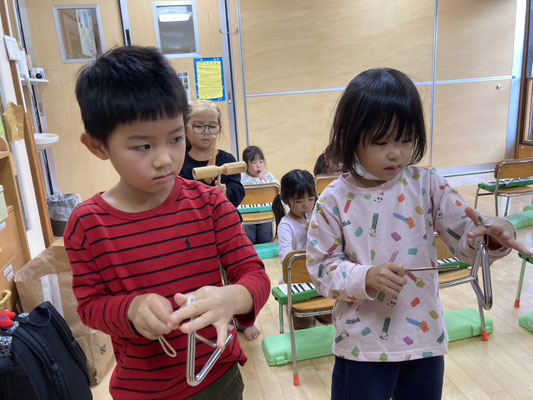 かぶとむし組 · 2025/11/19 音楽の日♪ 今日は先生に来てもらって月に一度音楽指導をしてもらう日でした♪ 今月の歌は「きのこ」と「はたけのポルカ」です。 「ポルカって何?どんなダンス?」ってみんなでイメージして踊りながら楽しく歌いました。 そして、クリスマス会での演奏に向けて、ピアニカ、トライアングル、ウッドブロックの叩き方をあらためて教えてもらいました。 かぶとむし組さんは初めてグロッケンも演奏します。 綺麗な音✨を響かせることができました。 『ひげじいさん』をみんなで合奏しました🎶 tagPlaceholderカテゴリ: 令和7年度かぶとむし組