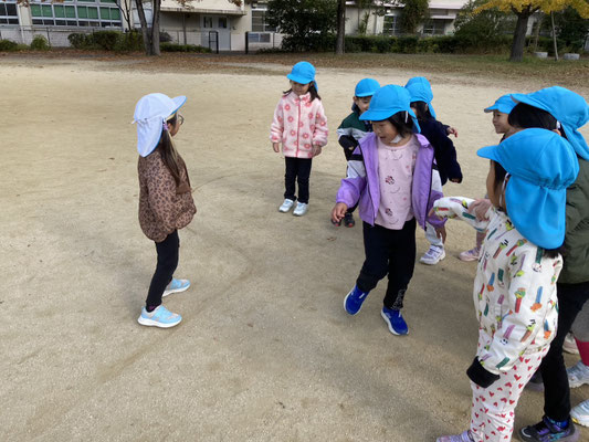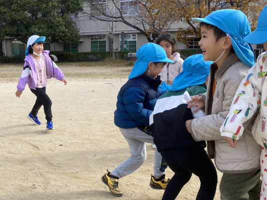 かぶとむし組 · 2025/12/04 ひょうたん鬼 公園で『ひょうたん鬼」をしました。 ひょうたんの形を地面に書いて、みんな中に入ります。 鬼👹はひょうたんの中には入れません。 ひょうたんの中は子の安全地帯です。 鬼はひょうたんの外から手を伸ばしてタッチします。 ひょうたんの形が小さすぎたかな😅 おしくらまんじゅうのようになって、キャーキャー楽しみました✨ tagPlaceholderカテゴリ: 令和7年度かぶとむし組