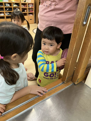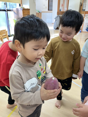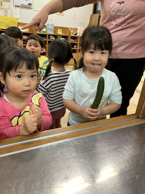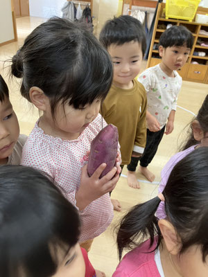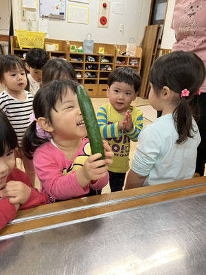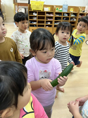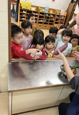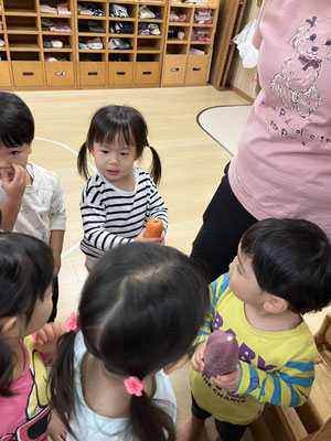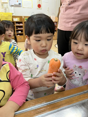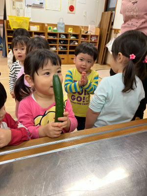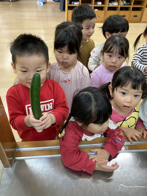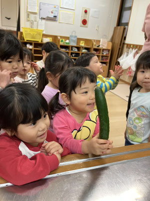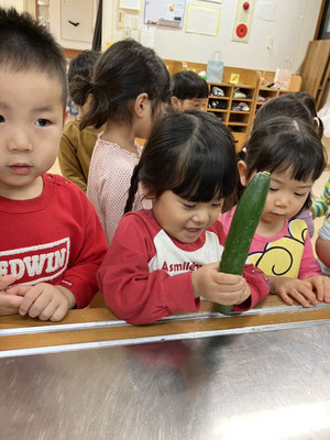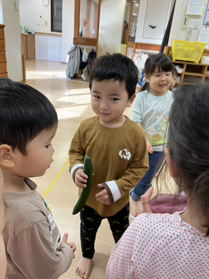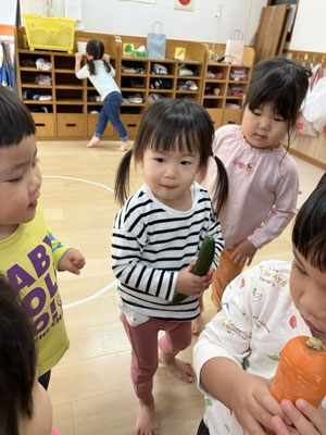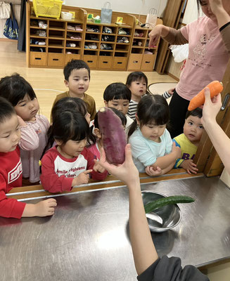 「今日はおさかなとスパゲティーサラダよ」と教えてもらい、食材のさつまいも🍠にんじん🥕きゅうり🥒を触らせてもらいました。