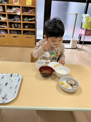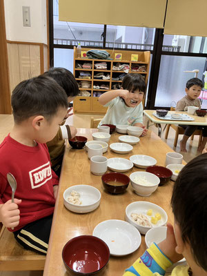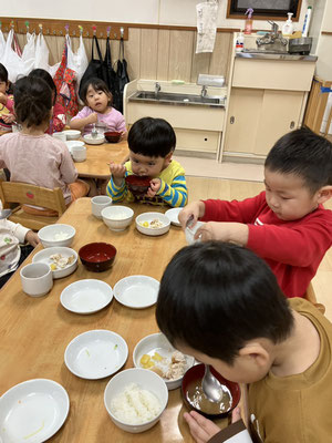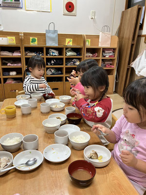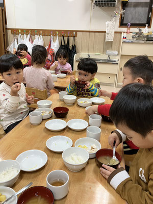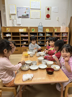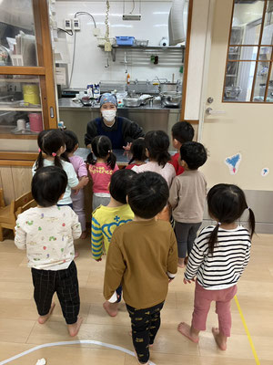 散歩の帰り、いつも「今日のお給食何かなぁ」とお給食を楽しみにしている子どもたち。