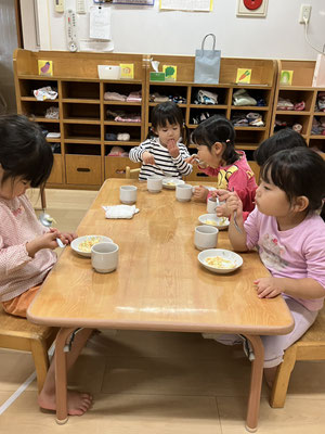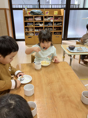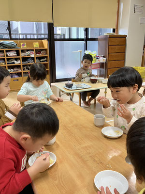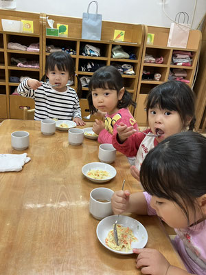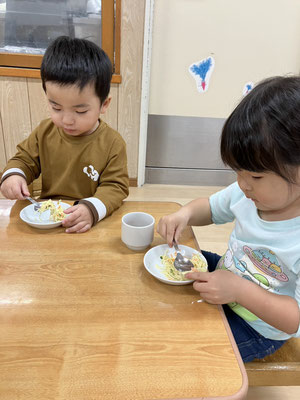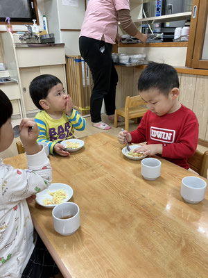 お給食でスパゲティーサラダをたべるど「とっても美味しい🩷」と全員、残さず食べ、おかわりをする子どもたちがたくさんいましたよ😊
