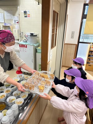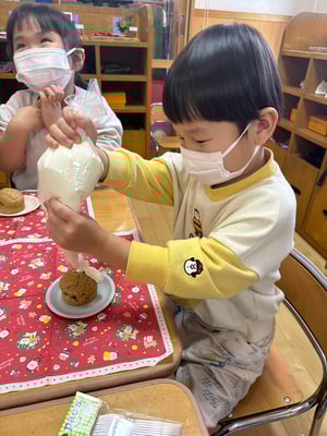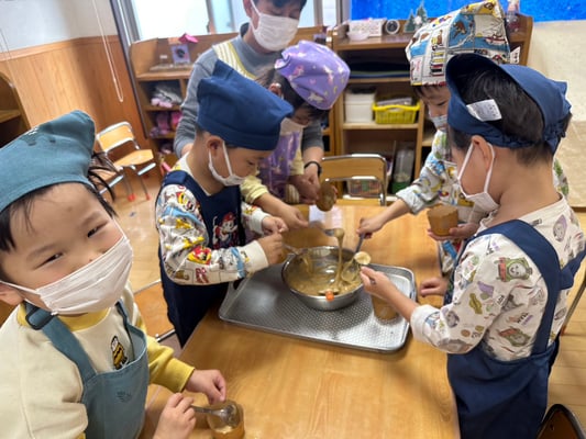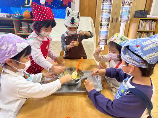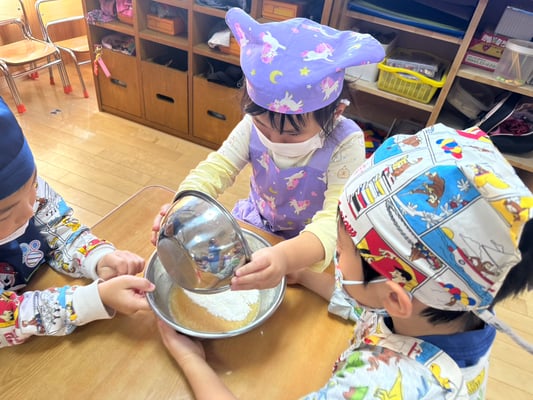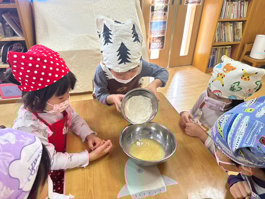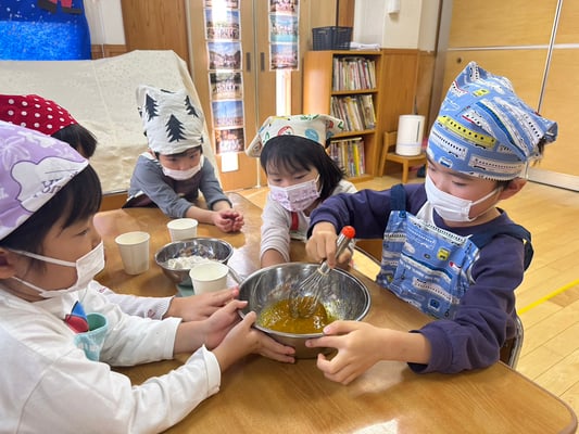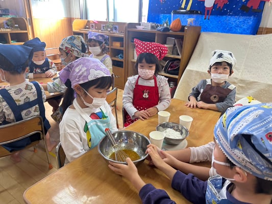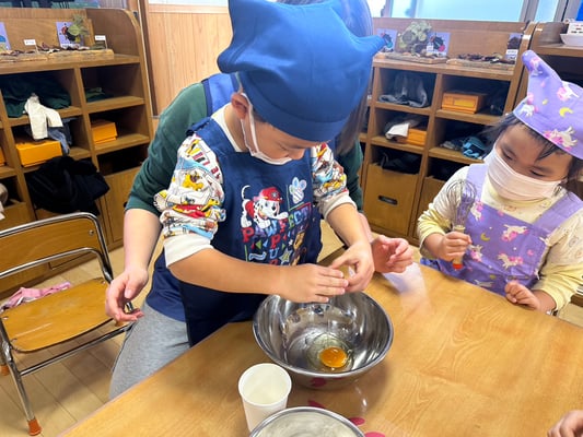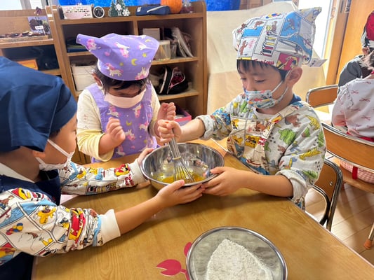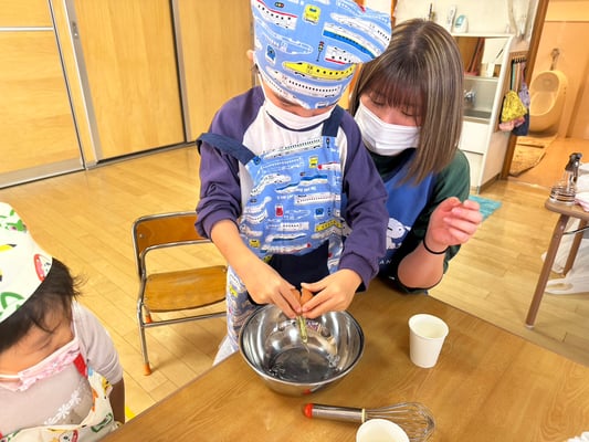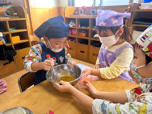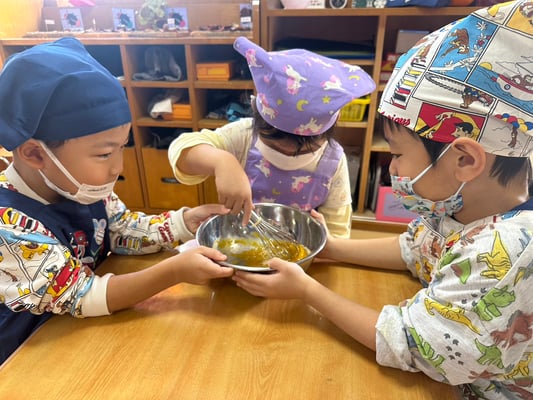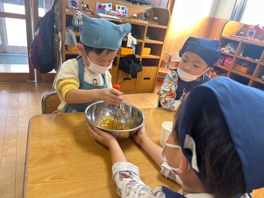 材料は自分たちで役割を決め取りに行ったり、卵も自分たちで割ったり、と子どもたち同士でボウルを持ち合い協力して作りました♪