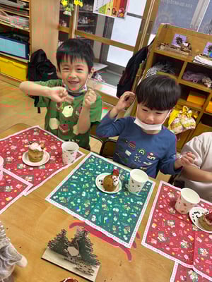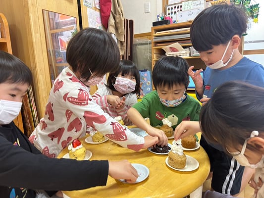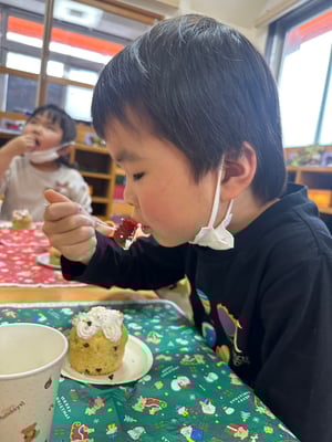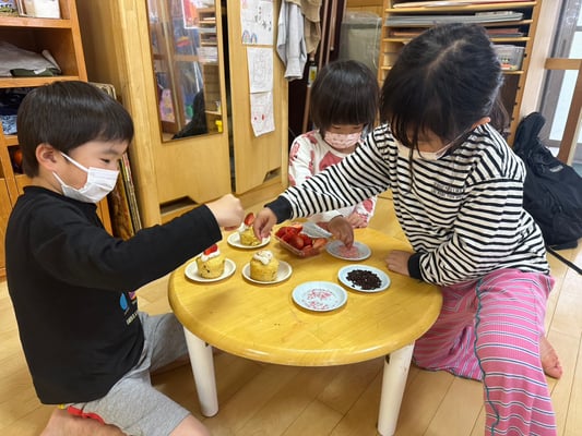 “かんぱーい”とみんなでお茶で乾杯🥂“おいしい〜”“しあわせ〜”“いちごおいしいよな〜”“みんなでつくるとさいこ〜”と幸せそうな笑顔にほっこりしました🤭