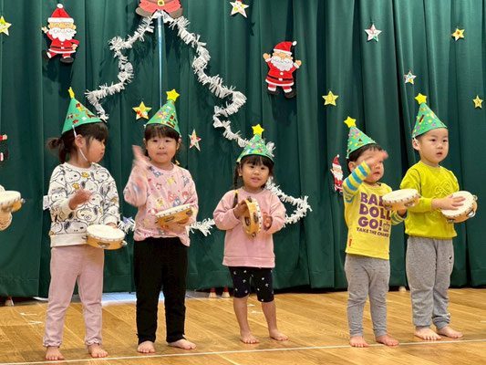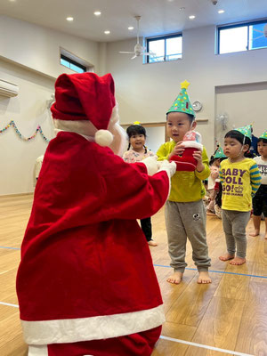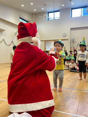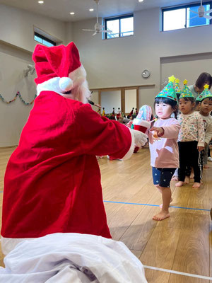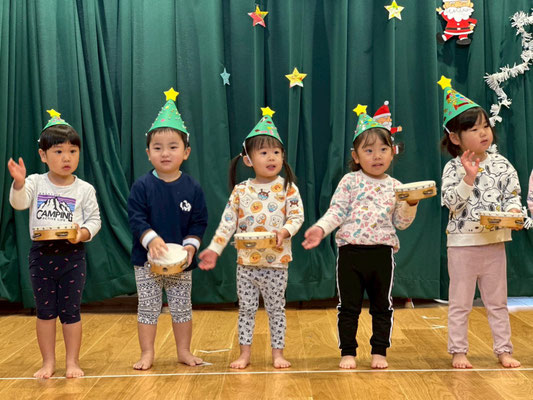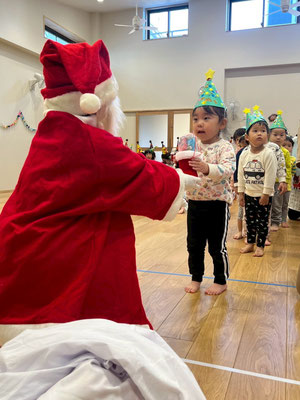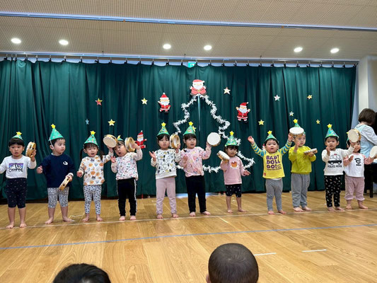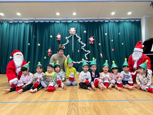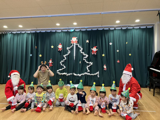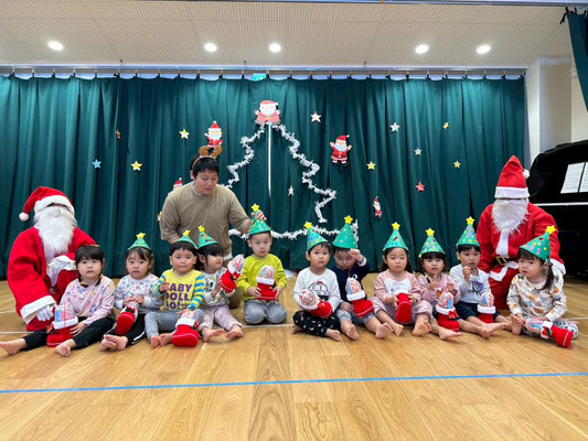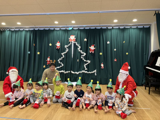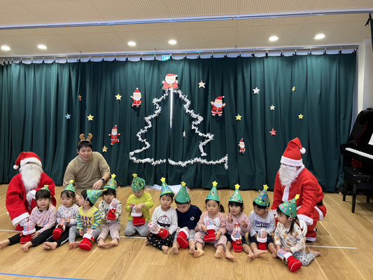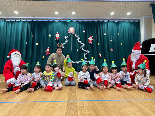 みつばち組 · 2025/12/23 クリスマス会 楽しみにしていた、クリスマス会🎄 写真屋さんやビデオカメラが設置されていて、少し緊張していたみつばちさんですが、とっても上手でしたよ😊 サンタさん🎅が登場してプレゼント🎁をもらう時サッと並んでかっこいいみつばちさん‼️ 「ありがとう」と言ってプレゼントをもらいとっても嬉しそうでしたよ♫ tagPlaceholderカテゴリ: 令和7年度みつばち組