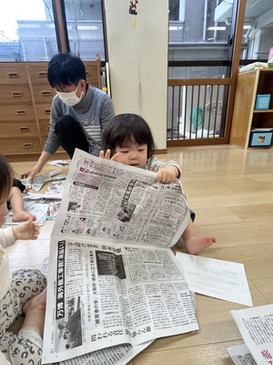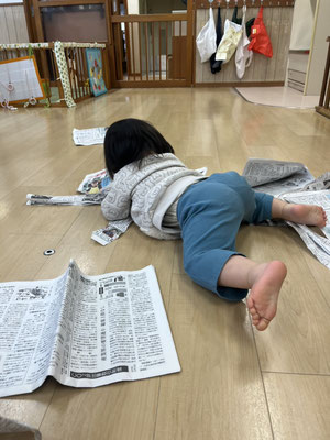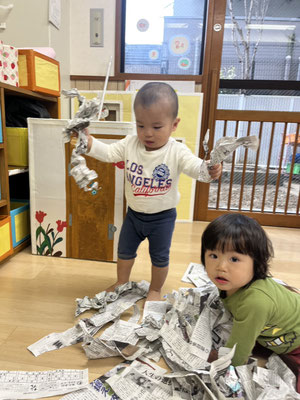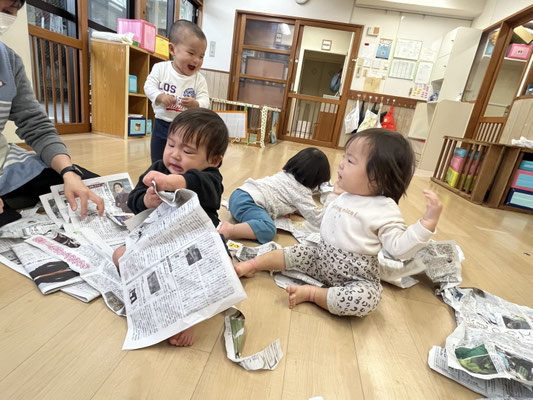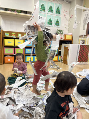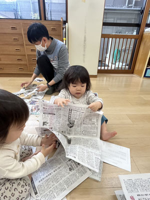かたつむり組 · 2025/12/24 新聞ビリビリ〜‼︎ お部屋で新聞あそびをしました。新聞を出すとみんな集まってきて「せんせい、ちょうだい!」という目で訴えます。 手元に新聞紙がくると、両手を使って破きます。 だんだん破いた新聞が増えてくると、手足をバタバタさせたり、新聞の上に寝転がったりして感触を楽しんでいました。 小さい両腕で新聞を持ってパーッと散らして友達と笑い合っていました。 新聞があるだけで、全身を使って遊べます^_^ tagPlaceholderカテゴリ: 令和7年度かたつむり組